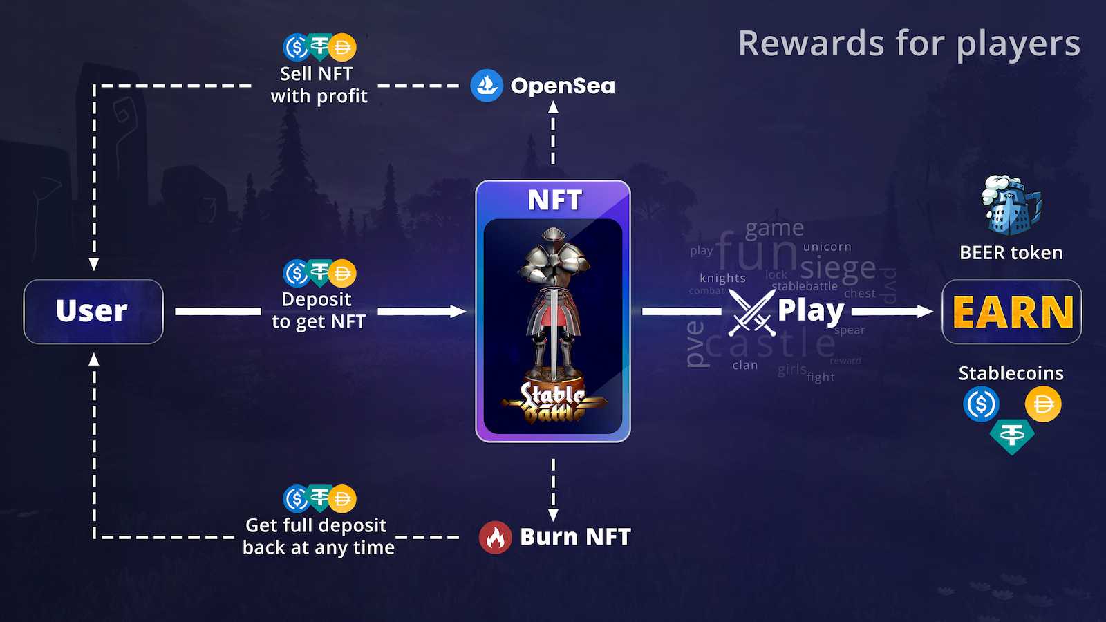 StableBattle is a multiplayer medieval hack and slash game that lets players earn financial rewards for playing well. These rewards are generated through a self-sustaining “stake to play and earn” GameFi model that adds a new dimension to gameplay. The player mints an NFT character by staking their stablecoins (i.e. temporarily locking in some of their savings), which will be put to work creating a yield via DeFi strategies. Most of this yield will be distributed back to winning players, while *all* players can take back their initial capital plus a small “thank you” yield.
